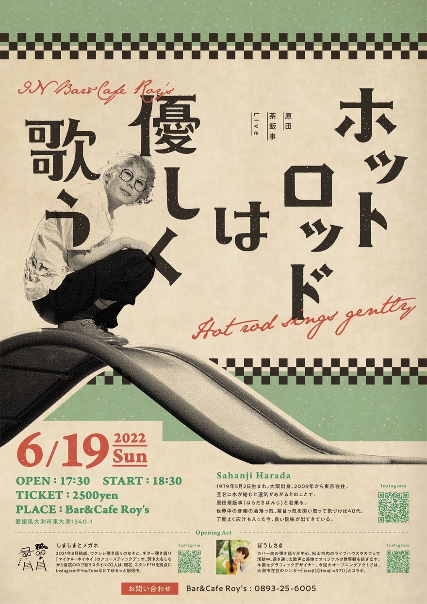 2022.06.19 (Sun) 愛媛 大洲 Bar&Cafe ROY'S 「ホットロッドは優しく歌う」 ライブ 出演 原田茶飯事 帽子さき×寺岡孝二 しましまとメガネ 開場/開演 18:00/18:30 前売/当日 2500円/3000円(ともに+1ドリンクオーダー) 住所 愛媛県大洲市1340−1 ライブの予約はこちら Live Schedule
