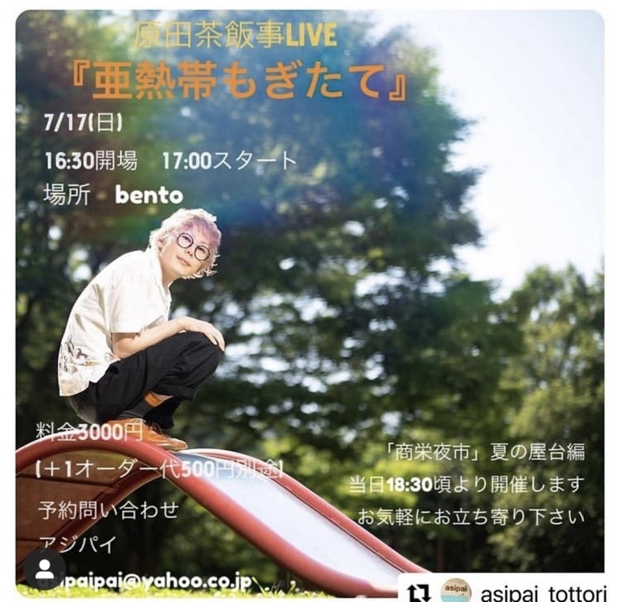 2022.07.17 (Sun) 鳥取 鳥取市bento(アジパイ 下) 「亜熱帯もぎたて」 ライブ 出演 原田茶飯事 開場/開演 16:30/17:00 チャージ 3000円(+1オーダー別途500円) 住所 鳥取県鳥取市商栄町254ー 1 ※18:30頃から会場前で夏の屋台村「商栄夜市」開催。 ライブの予約はこちら Live Schedule