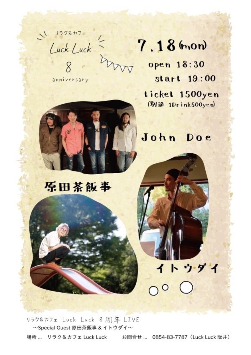 2022.07.18 (Mon) 島根 大田 リラク&カフェLuckLuck 「LuckLuck8Anniversary Live」 ライブ 出演 原田茶飯事 イトウダイ John Doe 開場/開演 18:30/19:00 前売りのみ 1500円(+1ドリンク代別途) 住所 島根県大田市大田町大田ハ67番地 ライブの予約はこちら Live Schedule