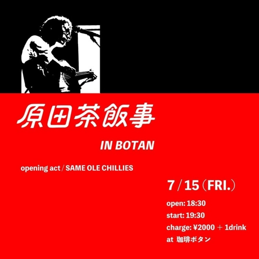 2022.07.15 (Fri) 愛知 犬山 珈琲ボタン 「原田茶飯事 IN BOTAN 」 ライブ 出演 原田茶飯事 [Opening Act]SAME OLE CHILLIES 開場/開演 18:30/19:00 前売り/当日 前売り当日ともに2000円(ともに+1ドリンクオーダー) 住所 愛知県犬山市東古券661 ライブの予約はこちら Live Schedule