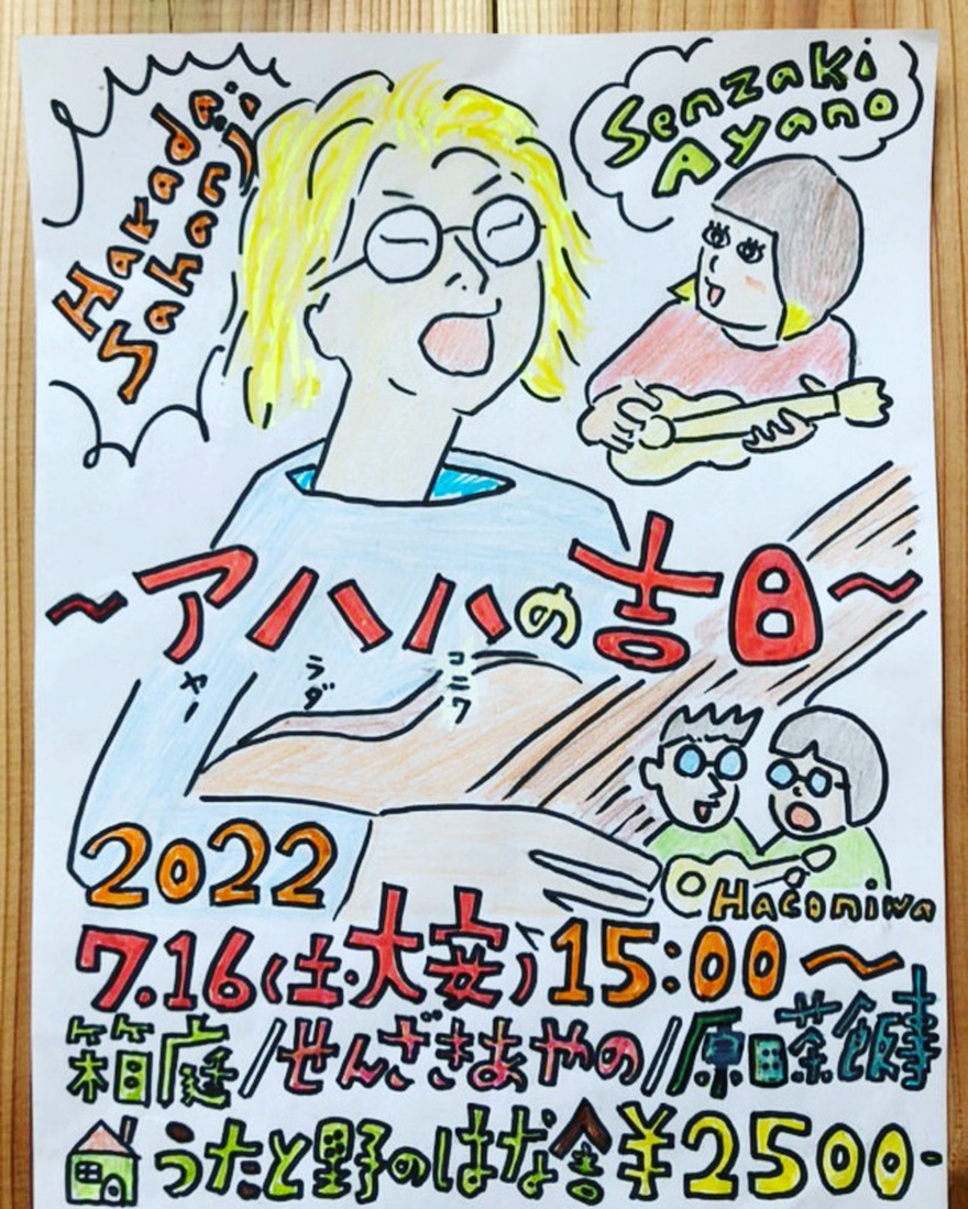 2022.07.16 (Sat) 兵庫 姫路 うたと野のはな舎 「アハハの吉日」 ライブ 出演 原田茶飯事 箱庭 せんざきあやの 開場/開演 15:00/16:00 料金 2500円 ※入場時に受付でお支払いください。 住所 兵庫県姫路市林田町奥佐見411−3 ライブの予約はこちら Live Schedule