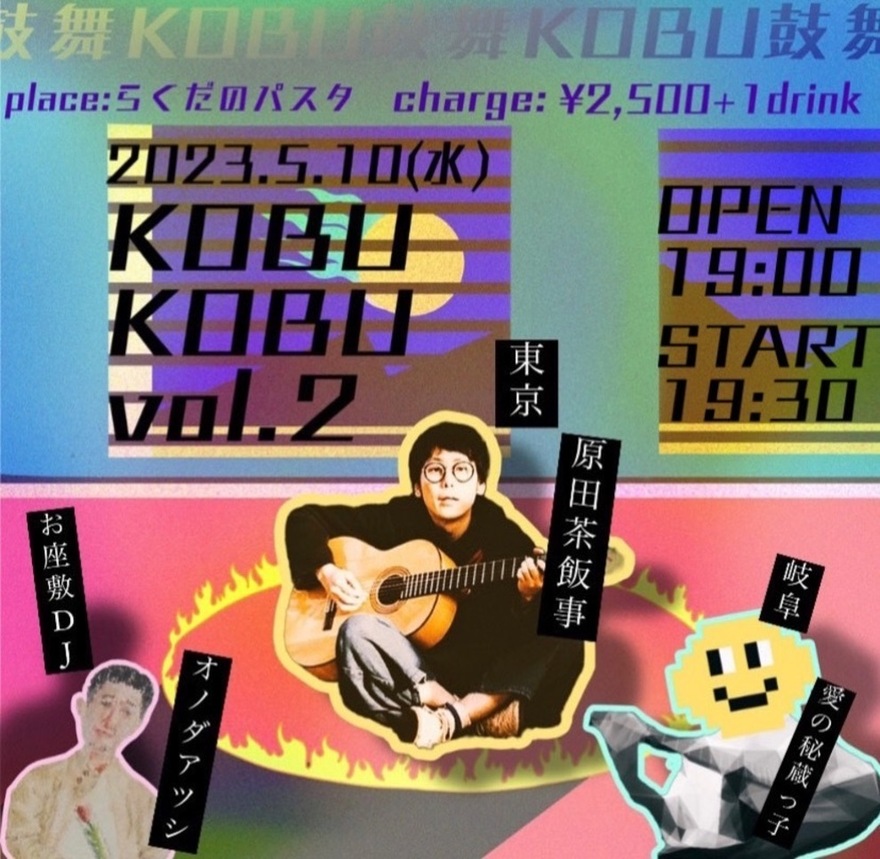 2023.05.10 (Wed) 岐阜 各務原 らくだのパスタ KOBU KOBU vol.2 ライブ 出演 原田茶飯事 [オープニングアクト]愛の秘蔵っ子 [DJ]ブラジルおじさん 開場/開演 19:00/19:30 前売/当日 前売当日ともに2500円(ともに1ドリンクオーダー別途) 住所 岐阜県各務原市那加桜町3-202-2 かもす食堂 ライブの予約はこちら Live Schedule
