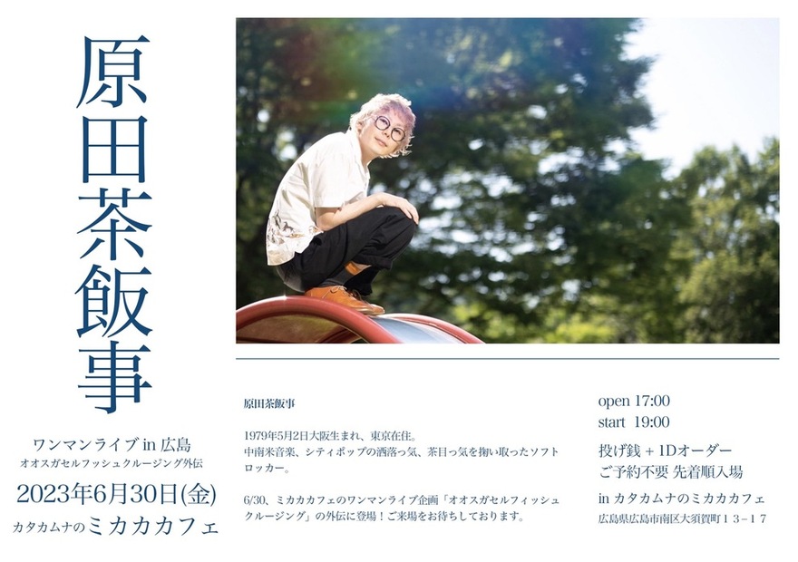 2023.06.30 (Fri) 広島 広島市 カタカムナのミカカカフェ オオツカセルフィッシュクルージング外伝 ライブ 出演 原田茶飯事 開場/開演 17:00/19:00 前売/当日 入場無料 投げ銭制(要1オーダー) ※予約不要 入場順 住所 広島県広島市南区大須賀町13−17 ライブの予約はこちら Live Schedule