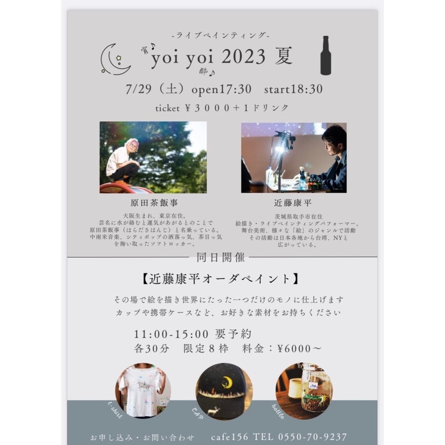 2023.07.29 (Sat) 静岡 御殿場 cafe156 yoi yoi 2023 夏 ライブ 出演 原田茶飯事 [ライブペインティング]近藤康平 開場/開演 17:30/18:30 前売/当日 前売当日ともに3000円(ともに1ドリンクオーダー別途) 住所 静岡県御殿場市北久原275 ライブの予約はこちら Live Schedule