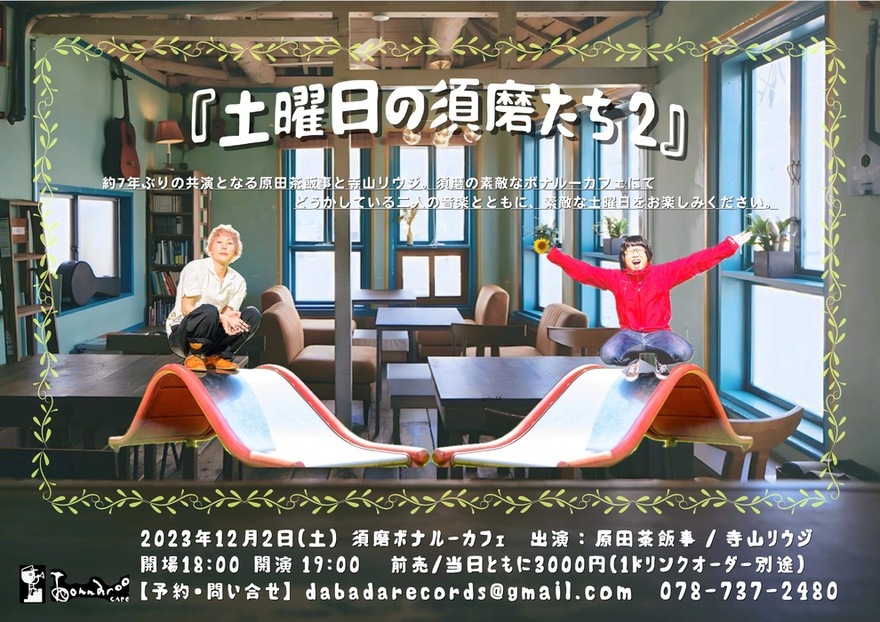 2023.12.02 (Sat) 兵庫 須磨 ボナルーカフェ 土曜日の須磨たち2 ライブ 出演 原田茶飯事 寺山リウジ 開場/開演 18:00/19:00 前売/当日 3000円/3500円 ライブの予約はこちら Live Schedule