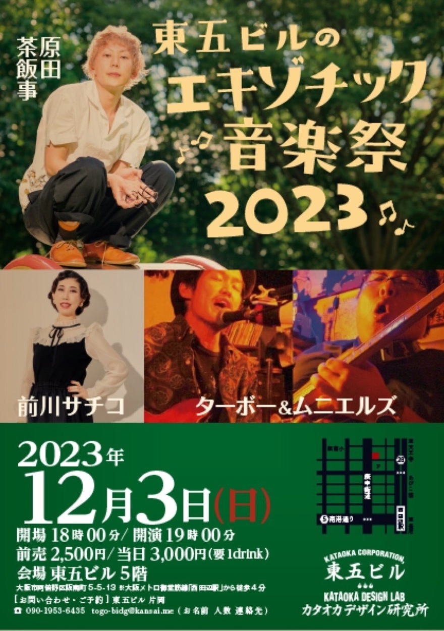 2023.12.03 (Sun) 大阪 西田辺 東五ビル5階 東五ビルのエキゾチック音楽祭2023 ライブ 出演 原田茶飯事 前川サチコ ターボー&ムニエルズ 開場/開演 18:00/19:00 前売/当日 2500円/3000円(ともに1ドリンクオーダー別途) 住所 大阪府大阪市阿倍野区阪南町5-5-13 ※大阪メトロ御堂筋線西田辺駅から徒歩4分 ライブの予約はこちら Live Schedule
