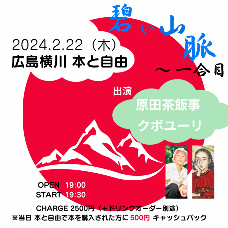 2024.02.22 (Thu) 広島 横川 本と自由 碧い山脈 〜一合目 ライブ 出演 原田茶飯事 クボユーリ 開場/開演 19:00/19:30 前売/当日 前売/当日ともに2500円(ともに1ドリンクオーダー別途) ※当日、本と自由で本を購入いただいたかたは500円キャッシュバック。 住所 広島県広島市西区横川町3丁目4−14 ライブの予約はこちら Live Schedule