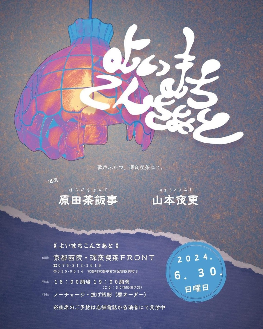 2024.06.30 (Sun) 京都 西院 深夜喫茶FRONT よいまちこんさあと ライブ 出演 原田茶飯事 山本夜更 開場/開演 18:00/19:00 (※19:50頃出演予定) 前売/当日 入場無料 投げ銭制(要1ドリンクオーダー別途) 住所 京都府京都市右京区西院巽町3 ※西院駅から徒歩2分 ライブの予約はこちら Live Schedule