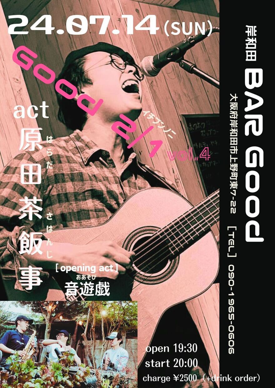 2024.07.14 (Sun) 大阪 岸和田 BAR Good Good イチブンノニ vol.4 ライブ 出演 原田茶飯事 [オープニングアクト]音遊戯 開場/開演 19:30/20:00 前売/当日 2500円/3000円(ともに1ドリンクオーダー別途) 住所 大阪府岸和田市上野町東7−22 (南海本線 和泉大宮駅から徒歩2分) ライブの予約はこちら Live Schedule