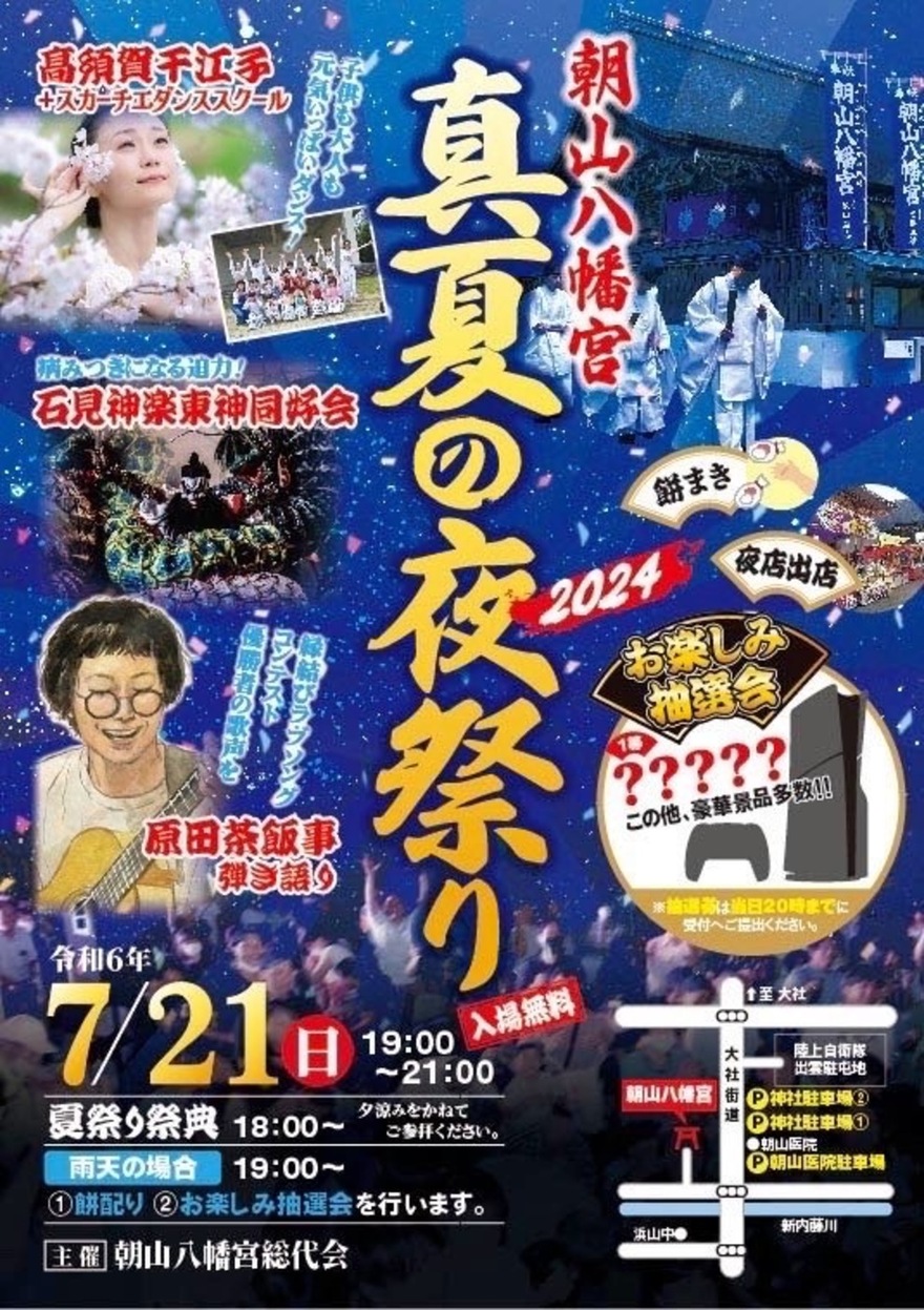 2024.07.21 (Sun) 島根 出雲 朝山八幡宮 真夏の夜祭り2024 ライブ 出演 原田茶飯事 高須賀千江子(ダンス) 開場/開演 18:00/19:00 前売/当日 入場無料 ライブの予約はこちら Live Schedule
