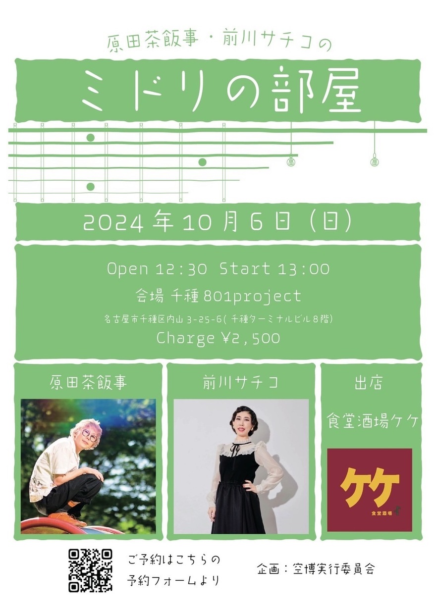 2024.10.06 (Sun) 愛知 千種 801project ミドリの部屋 ライブ 出演 原田茶飯事 前川サチコ [フード出店] 食堂酒場ケケ 開場/開演 12:30/13:00 前売/当日 前売/当日ともに2500円(1ドリンクオーダー別途) 住所 名古屋市千種区内山3-25-6(千種ターミナルビル8階) ライブの予約はこちら Live Schedule