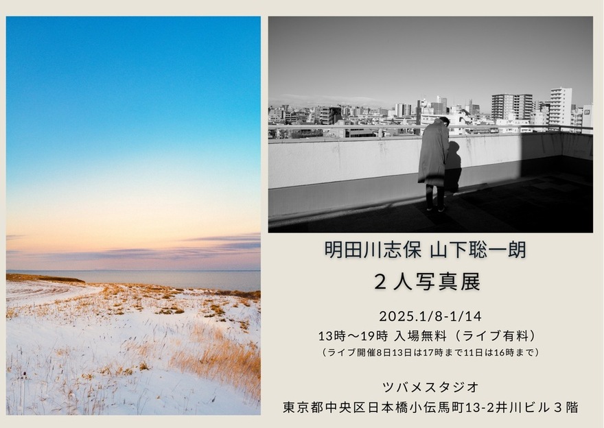 2025.01.11 (Sat) 東京 伝馬町 ツバメスタジオ 明田川志保 山下聡一朗 二人写真展 ライブ 出演 原田茶飯事 ミムトーメ 開場/開演 18:00/18:30 前売/当日 前売/当日ともに3000円 住所 東京都中央区日本橋小伝馬町 13-2 井川ビル3階 Live Schedule