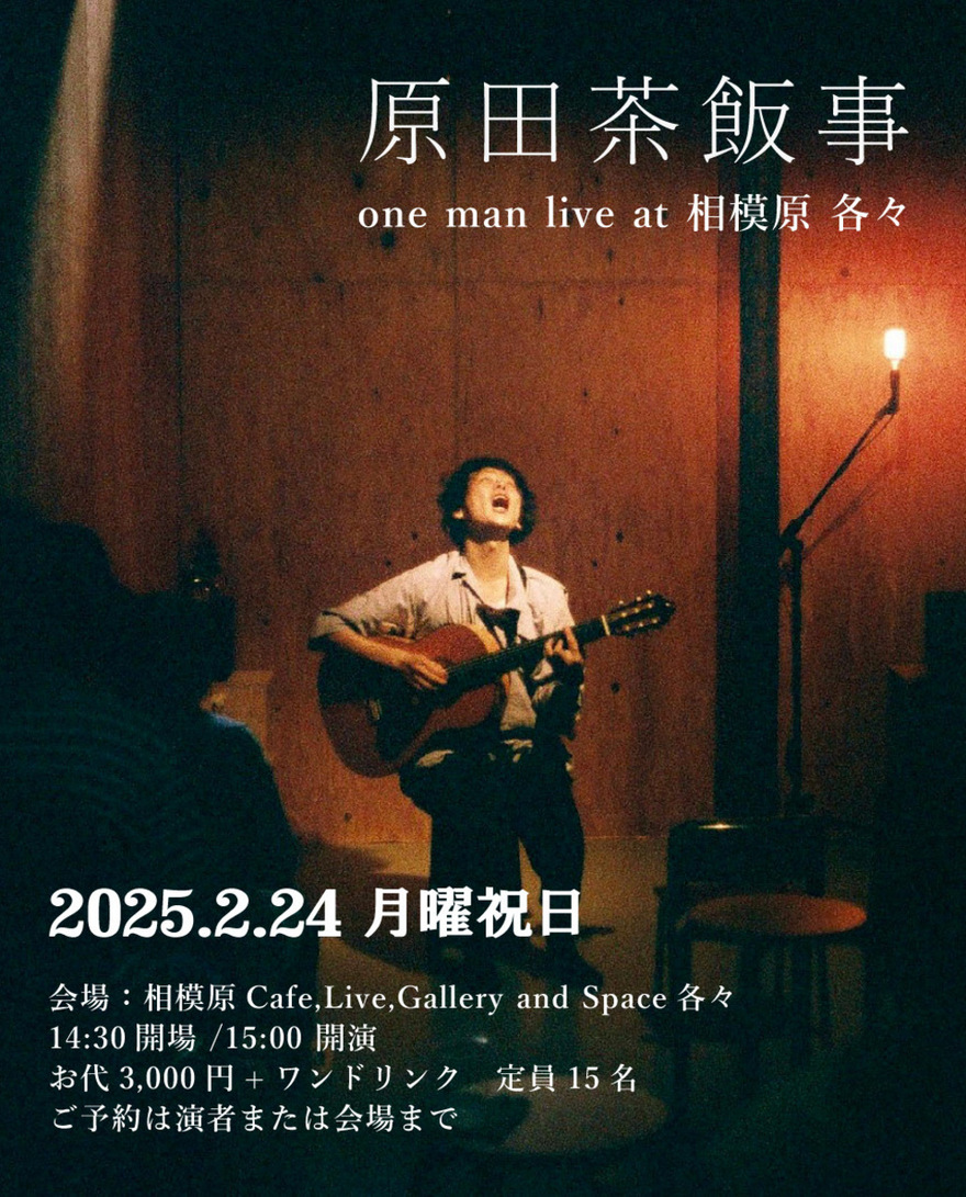2025.02.24 (Mon) 神奈川 相模原 各々 原田茶飯事 生音 単独公演 ライブ 出演 原田茶飯事 開場/開演 14:30/15:00 前売/当日 前売/当日ともに3000円(+1ドリンクオーダー別途) Live Schedule
