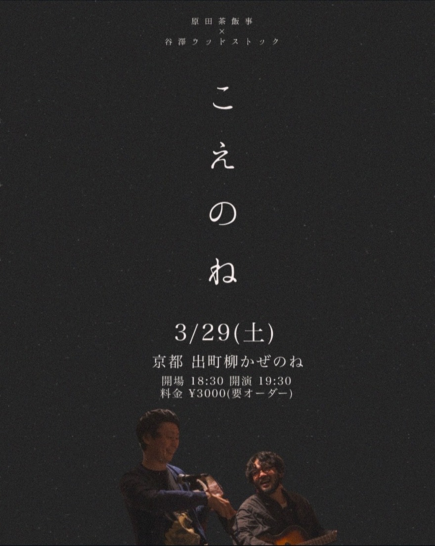2025.03.29 (Sat) 京都 出町柳 かぜのね こえのね ライブ 出演 原田茶飯事 谷澤ウッドストック [オープニングゲスト]リーテソン 開場/開演 18:30/19:30 料金 3000円(+ドリンクオーダー別途) 住所 京都府京都市左京区田中下柳町7−2 ライブの予約はこちら Live Schedule