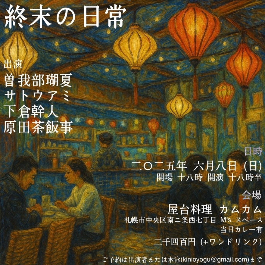 2025.06.08 (Sun) 北海道 札幌 屋台料理 カムカム 終末の日常 ライブ 出演 原田茶飯事 曽我部瑚夏 サトウアミ 下倉幹人 開場/開演 18:00/18:30 前売/当日 前売/当日ともに2400円(+1ドリンクオーダー別途) 住所 札幌市中央区南二条西七丁目 M's スペース Live Schedule