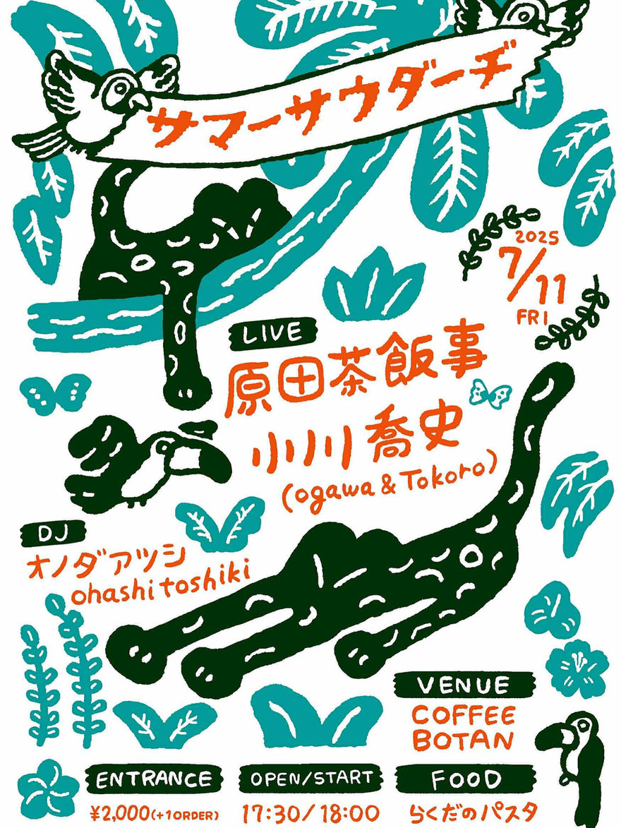 2025.07.11 (Fri) 愛知 犬山 珈琲ボタン サマーサウダーヂ ライブ 出演 原田茶飯事 小川喬史 (Ogawa&Tokoro) 【DJ】 ・オノダアツシ ・ohashi toshiki 【FOOD】 ・らくだのパスタ 開場/開演 17:30/18:00 前売/当日 前売/当日ともに2000円(1ドリンクオーダー別途) Live Schedule