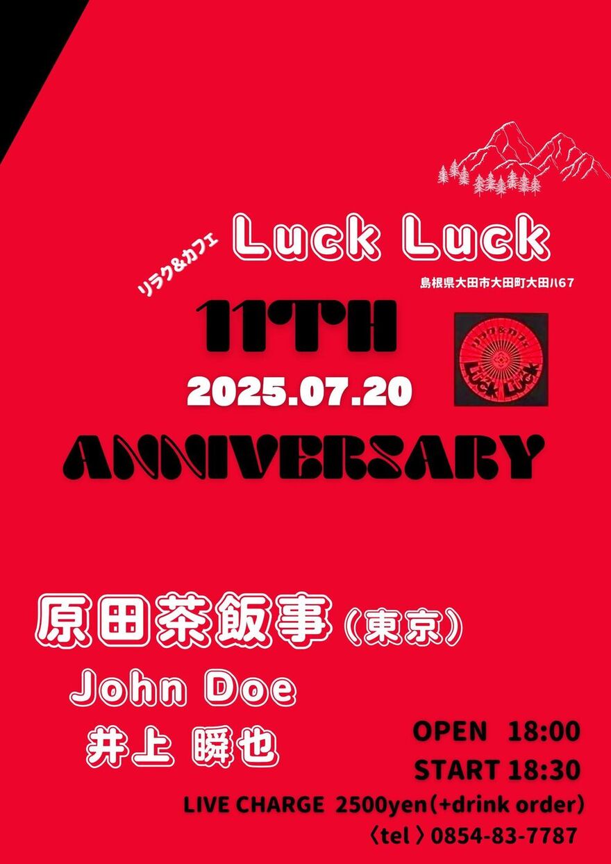 2025.07.20 (Sun) 島根 大田市 リラク&カフェLUCK LUCK LUCK LUCK 11周年アニバーサリー ライブ 出演 原田茶飯事 John Doe 井上瞬也 開場/開演 18:00/18:30 前売/当日 前売/当日ともに2500円(+1ドリンクオーダー別途) 住所 島根県大田市大田町大田ハ67 Live Schedule