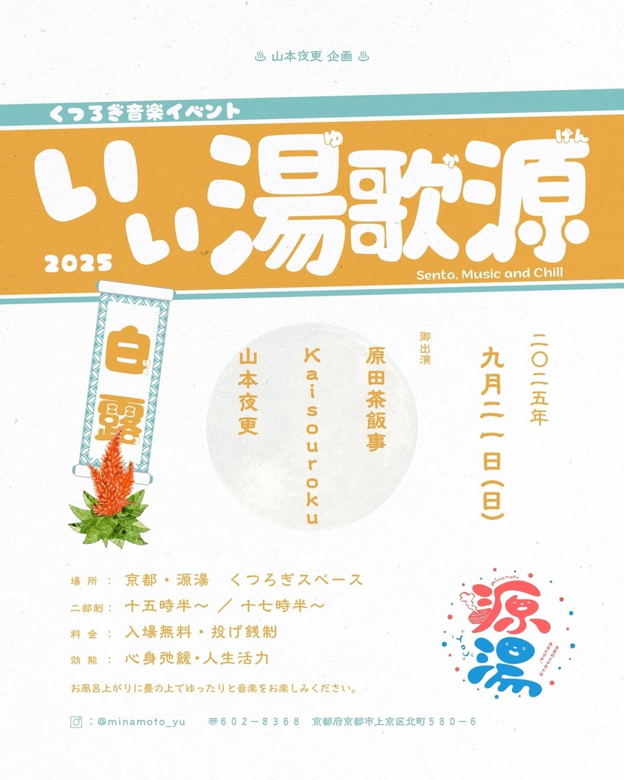 2025.09.21 (Sun) 京都 西院 源湯 くつろぎスペース 山本夜更presents「 いい湯歌源 」 ライブ 出演 原田茶飯事 山本夜更 Kaisouroku 開場/開演 15:00/15:30 17:00/17:30 (2部構成) 前売/当日 入場無料 投げ銭制 住所 京都府京都市上京区北町580-6 Live Schedule