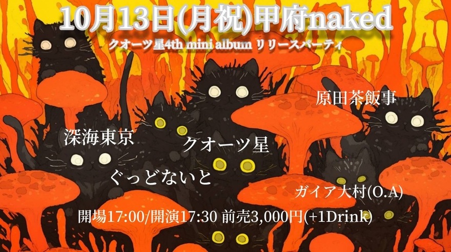 2025.10.13 (Mon) 山梨 甲府 ネイキッド クオーツ星リリースライブ ライブ 出演 原田茶飯事 クオーツ星 深海東京 ぐっどないと [オープニングアクト]ガイア大村 開場/開演 17:00/17:30(18:40頃出演予定) 前売/当日 3000円(1ドリンクオーダー別途) ライブの予約はこちら Live Schedule