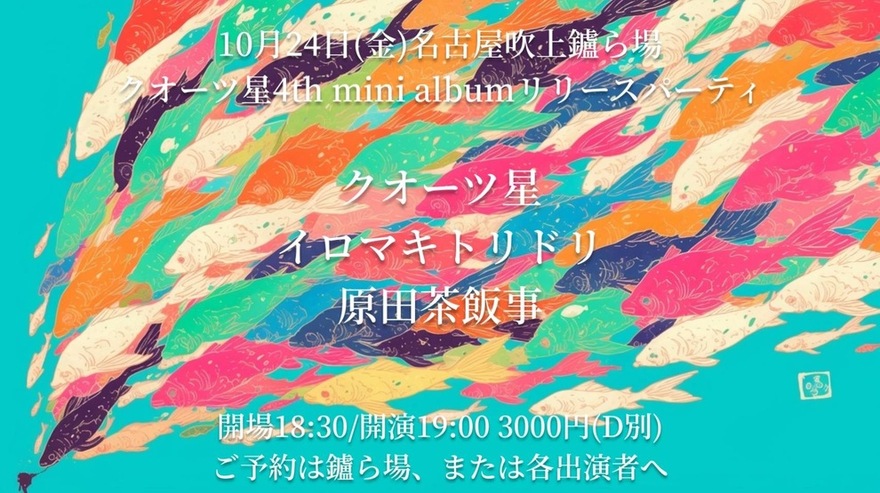 2025.10.24 (Fri) 愛知 吹上 鑪ら場 クオーツ星リリースライブ ライブ 出演 原田茶飯事 クオーツ星 イロマキトリドリ 開場/開演 18:30/19:00(原田茶飯事は19:00から出演予定) 前売/当日 前売/当日ともに3000円(1ドリンクオーダー別途) ライブの予約はこちら Live Schedule