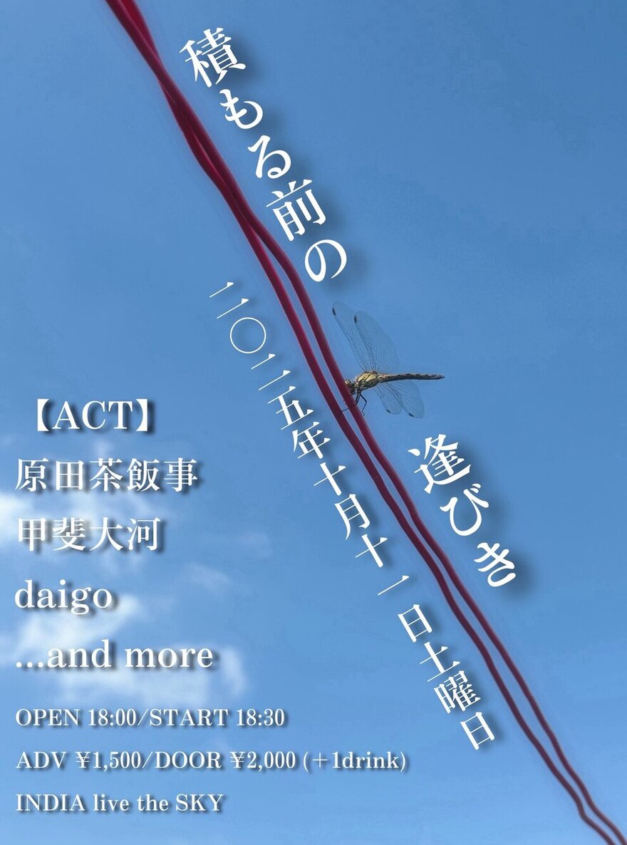 2025.10.11 (Sat) 長野 長野市 INDIA live the SKY 積もる前の逢びき-長野編 ライブ 出演 原田茶飯事 daigo 甲斐大河(from福島) and more… 開場/開演 18:00/18:30 前売/当日 1500円/2000円(ともに1ドリンクオーダー別途) ライブの予約はこちら Live Schedule