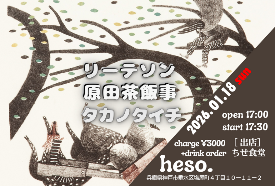 2026.01.18 (Sun) 兵庫 塩屋 heso. 吹雪かれて2026 ライブ 出演 原田茶飯事 リーテソン タカノタイチ [フード出店]ちせ食堂 開場/開演 17:00/17:30 料金 3000円(+1ドリンクオーダー別途) ライブの予約はこちら Live Schedule