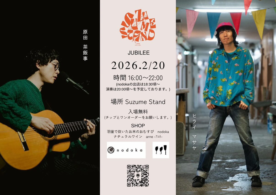 2026.02.20 (Fri) 山口 周南 Suzume Stand jubilee ライブ 出演 原田茶飯事 ヒライマサヤ [出店] nodoka(羽釜で炊いたお米のおむすび) arne -アルネ(ナチュラルワイン) 開場/開演 16:00/20:00(22時終演予定) 料金 入場無料 投げ銭制(+1ドリンクオーダー別途) ライブの予約はこちら Live Schedule