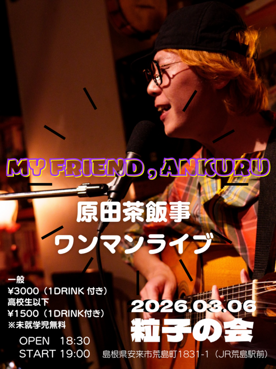 2026.03.06 (Fri) 島根 安来 粒子の会 MY FRIEND , ANKURU ライブ 出演 原田茶飯事 開場/開演 18:30/19:00 料金 [一般]3000円 [高校生以下]1500円 ※未就学児無料 住所 島根県安来市荒島町1831-1 (JR荒島駅降りてすぐ) ライブの予約はこちら Live Schedule