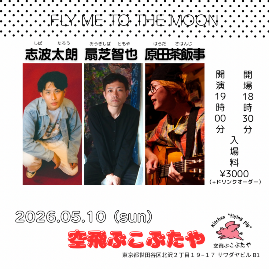 2026.05.10 (Sun) 東京 下北沢 空飛ぶこぶたや Fly Me To The Moon ライブ ご予約は日程、お名前、人数を明記の上 dabadarecords@icloud.com 出演 原田茶飯事 扇芝智也 志波太朗 開場/開演 18:30/19:00 料金 3000円(+1ドリンクオーダー別途) Live Schedule
